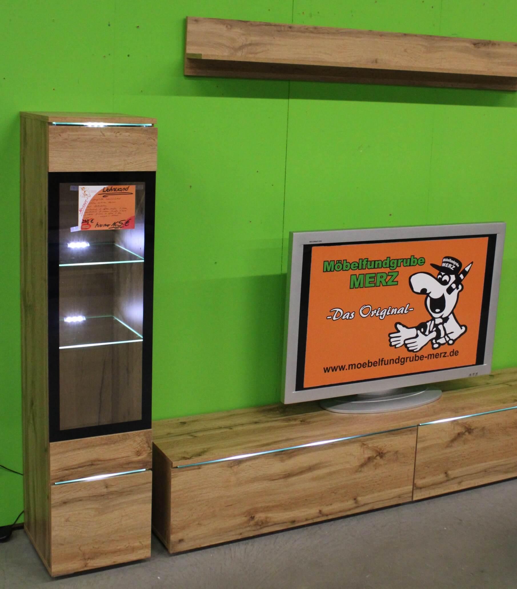 bestehend aus:2x Vitrinenelement mit jweils 2 Türen1 TV-Unterteil mit 3 Klappen1 Wandregal